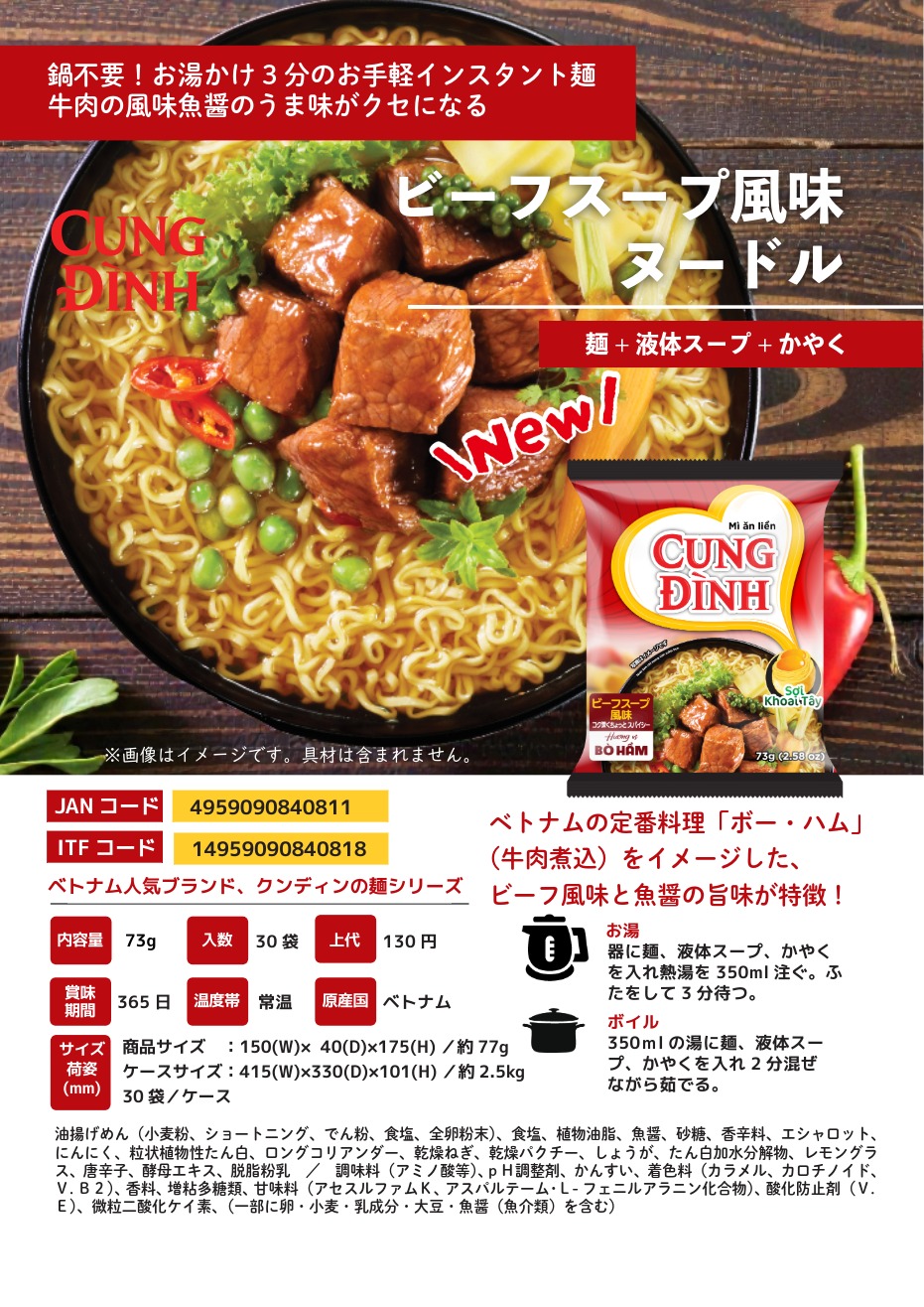 ベトナムの煮込み牛肉料理「ボー・ハム」の味を再現した、ビーフの風味とベトナム魚醤「ヌックマム」のうま味が麺に絡む一品です。ジャガイモでん粉と卵を練り込んだ麺が、コシのある豊かな風味を生み出しています。 麺類 インスタント麺