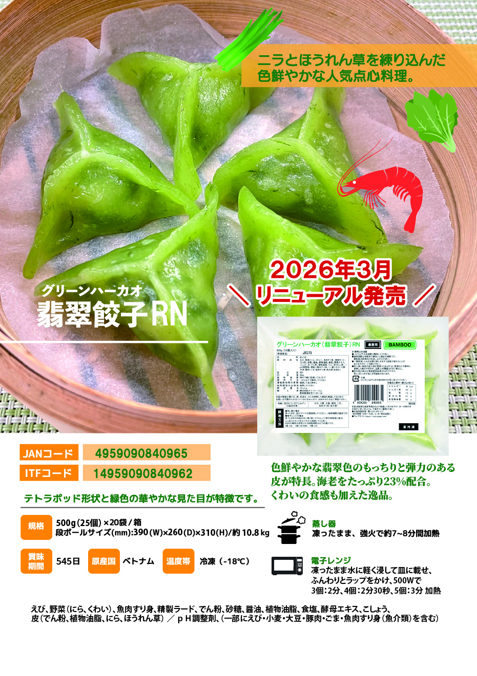 えび、野菜(にら、くわい)、魚肉すり身、精製ラード、でん粉、砂糖、醤油、植物油脂、食塩、酵母エキス、こしょう、皮(でん粉、植物油脂、にら、ほうれん草) / pH調整剤、(一部にえび・小麦・大豆・豚肉・ごま・魚肉すり身(魚介類)を含む)