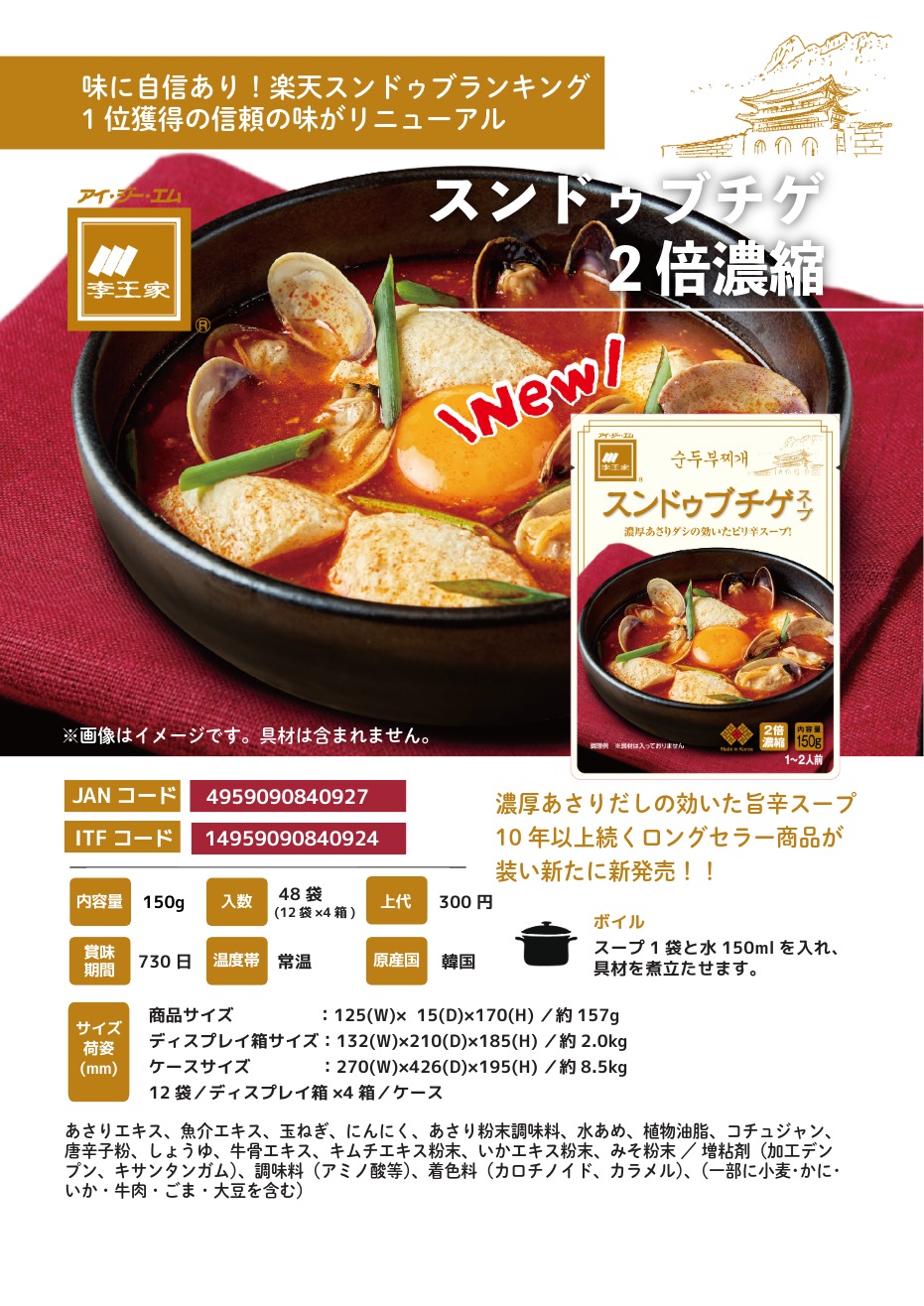 あさりエキス、魚介エキス、玉ねぎ、にんにく、あさり粉末調味料、水あめ、植物油脂、コチュジャン、唐辛子粉、しょうゆ、牛骨エキス、キムチエキス粉末、いかエキス粉末、みそ粉末 / 増粘剤(加工デンプン、キサンタンガム)、調味料(アミノ酸等)、着色料(カロチノイド、カラメル)、(一部に小麦・かに・いか・牛肉・ごま・大豆を含む)