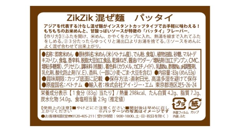 米めん(米(ベトナム産)、でん粉、食塩)、植物油脂、砂糖、マルトデキストリン、食塩、香辛料、脱脂大豆加工食品、乾燥ねぎ、醤油パウダー/増粘剤(加工デンプン、CMC、増粘多糖類)、グリセリン、調味料(核酸)、着色料(カラメル、カロチノイド)、乳酸Na、酢酸Na、pH調整剤、乳化剤、酸化防止剤(V.E)、香料、(一部に小麦・ごま・大豆を含む)