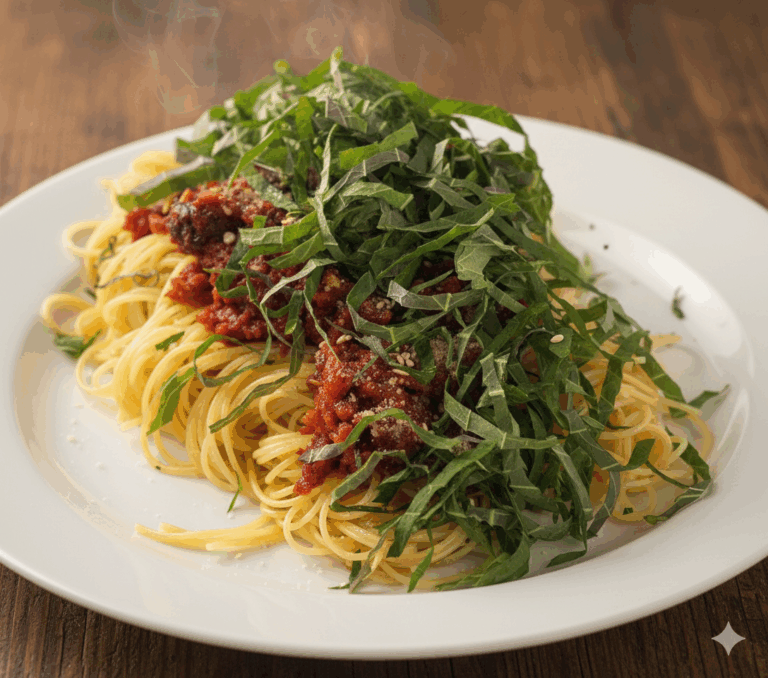 李王家チャンジャを使ったアレンジレシピ!食欲そそるチャンジャ冷製パスタをご紹介します。エゴマの葉(またはシソの葉)とごま油の香りがチャンジャとベストマッチ!明太子パスタ好きならきっと好きな味ですよ~。
