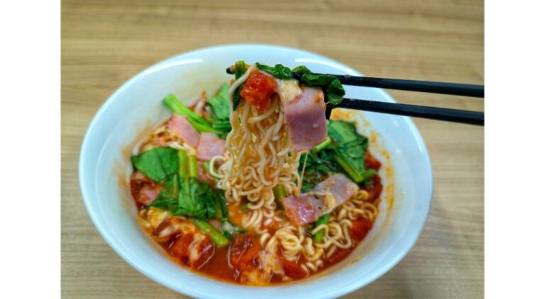 - 器に、インスタント麺、お湯、李王家プデチゲスープ、トマト缶の順に入れラップをして、電子レンジ600wで4分加熱する。
