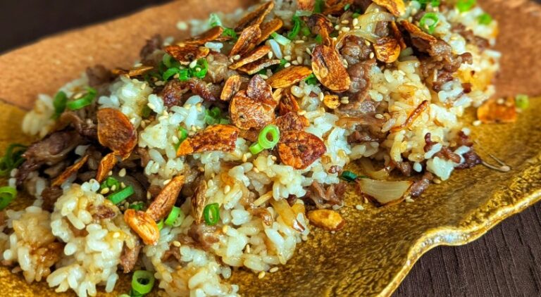 - 3.にご飯を加えほぐしながら炒め、しょうゆ少々を垂らしひと混ぜして器に盛り、白ごま、青ねぎ、にんにくをトッピングして完成。