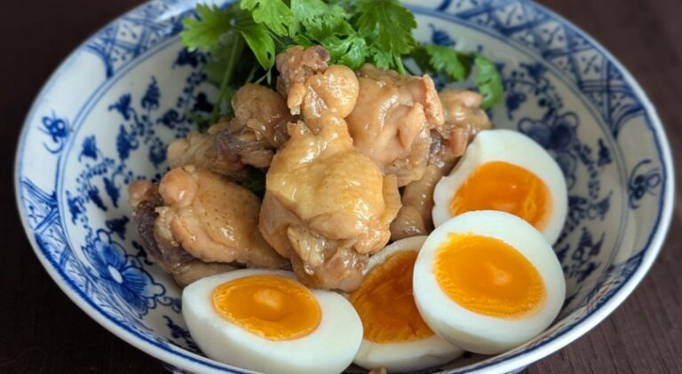 - 煮た鶏手羽元を温め直して器に盛り、4.のゆで卵を半分に切って盛り付け完成。
