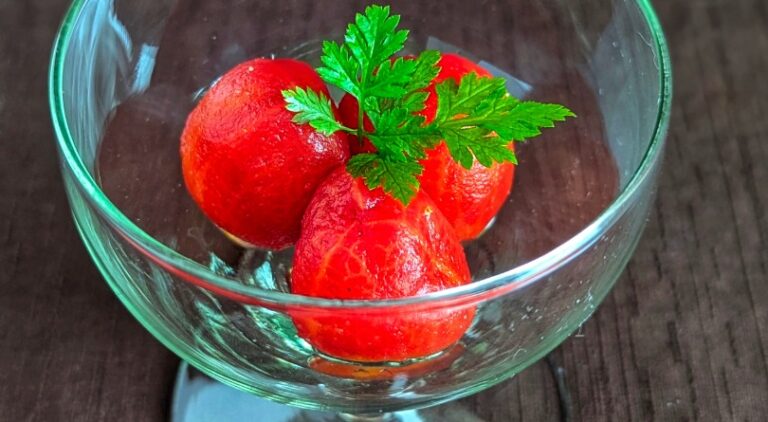 - ミニトマトはヘタを取り洗ってヘタの反対側に竹串か爪楊枝で1か所穴を開ける。沸騰したお湯に5~10秒浸け、冷水に取って皮をむく。※茹ですぎないようご注意ください。